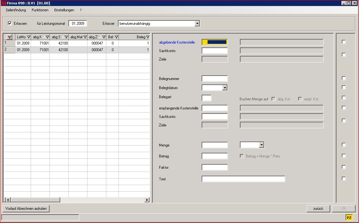 - Einfache Buchungen von Kostenstelle an Kostenstelle mit Eingabe des Betrags und der Zeilen.