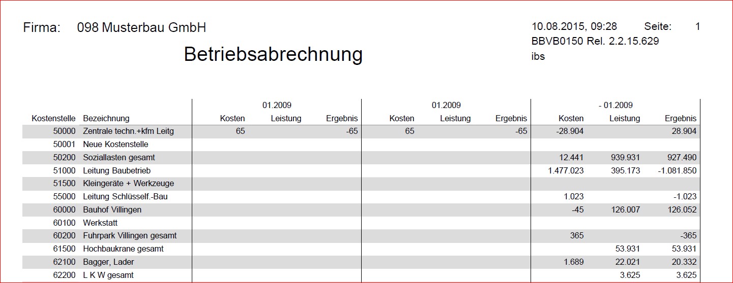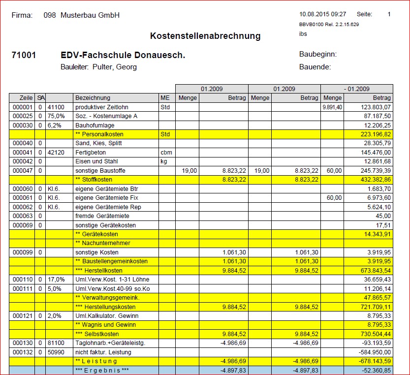 Die verrechneten Verwaltungs- und Vertriebsgemeinkosten werden in den Ergebnissen der Kostenstellen eines Verantwortungsbereichs (Betrieb oder Niederlassung) nicht berücksichtigt. Die Deckungsbeiträge der Baustellen werden in Prozent der Kosten ausgewiesen. Ein Soll-Deckungsbeitrag in Prozent lässt erkennen, welche Baustellen bei Deckung der vollen Kosten mit Gewinn und welche mit Verlust abgeschlossen haben.