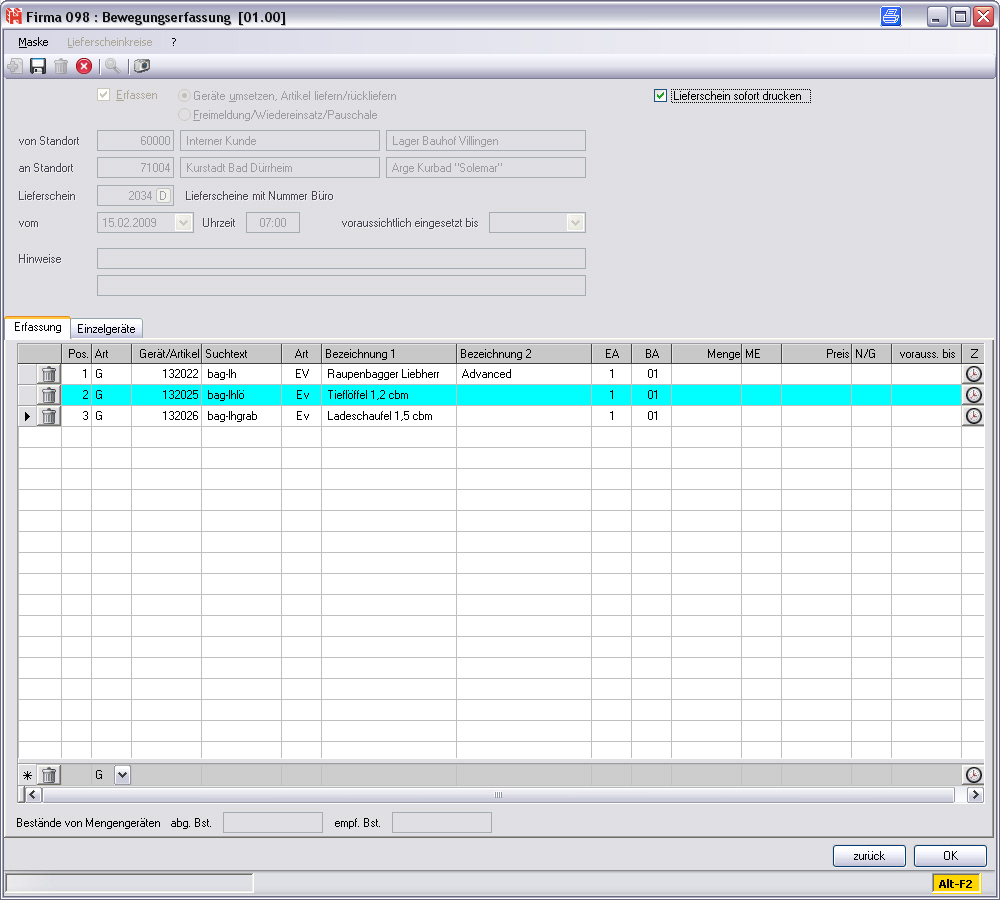 Bewegungserfassung für Einzel-, Mengengeräte und Artikel – relevant für die Abrechnung – steuerbar über die Einsatzart und Belegart